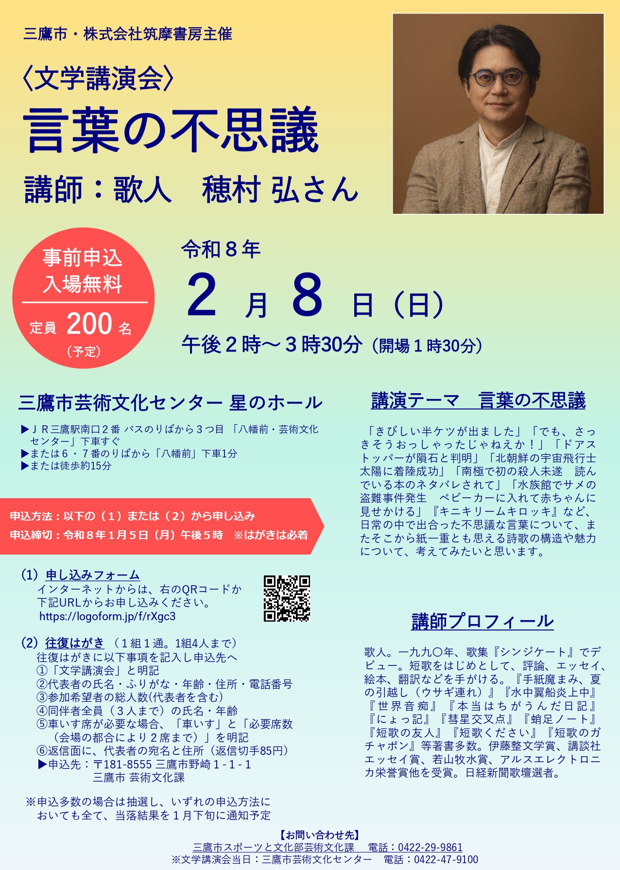 2026年2月8日(日) | 朗読・講演 | 歌人でエッセイストの穂村弘さんによる文学講演会「言葉の不思議」 | ![]() | 星のホール芸術文化センター | 申込受付中無料 |
